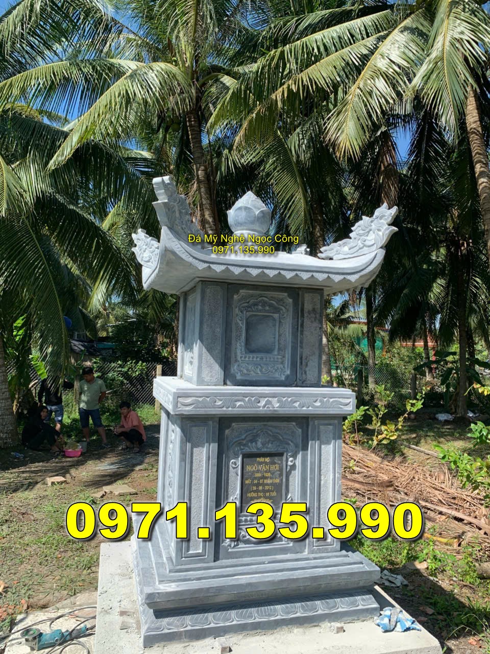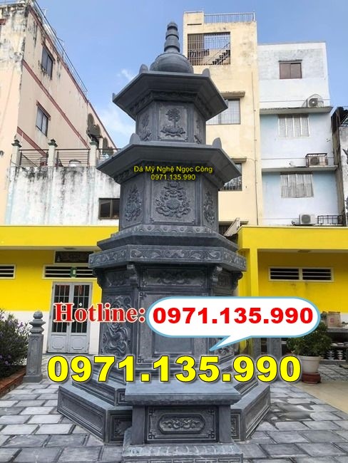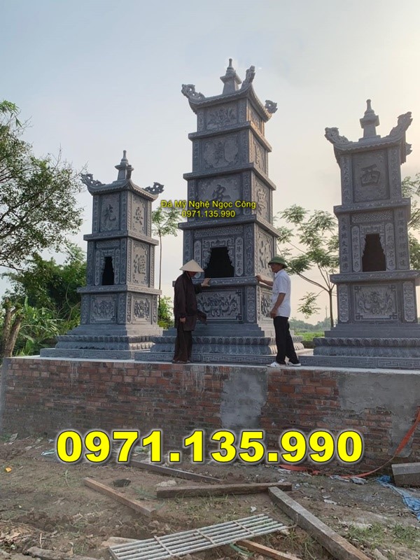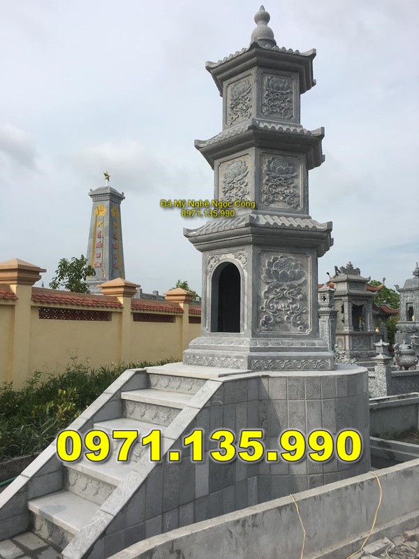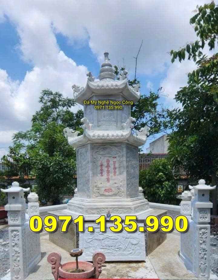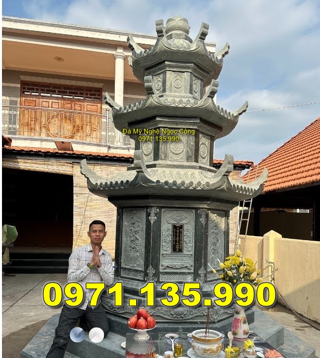 Mộ tháp đá lục giác: Với 6 cạnh đều nhau, mộ tháp lục giác tạo cảm giác cân đối và hài hòa. Mẫu mộ này thường được chế tác từ đá xanh nguyên khối, với ba tầng mái chồng lên nhau, mỗi tầng đều được chạm khắc hoa văn tinh xảo.