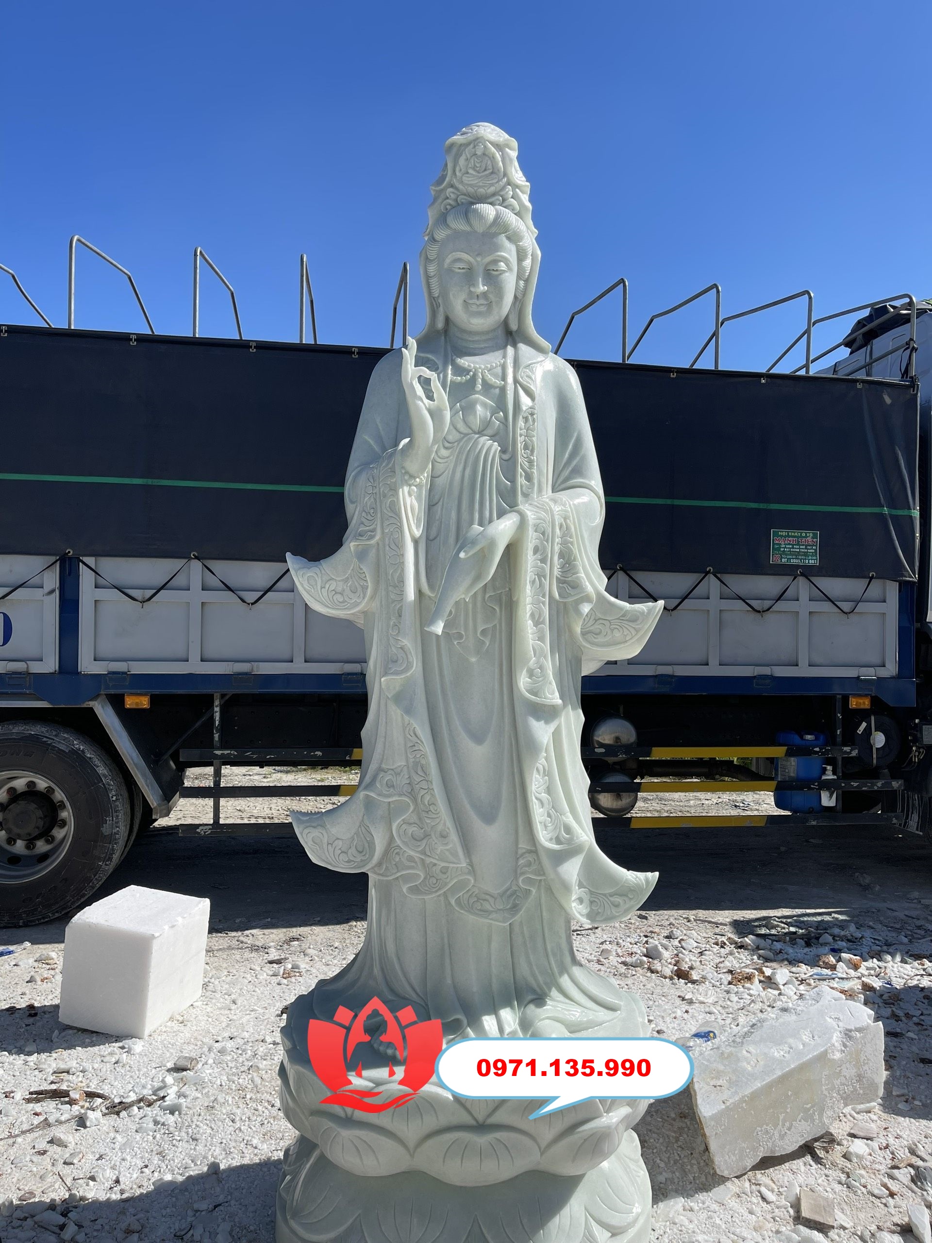 Màu sắc: Đá cẩm thạch tự nhiên thường có màu trắng ngà, trắng xanh hoặc xanh ngọc, tượng trưng cho sự thanh khiết, cao quý và thuần tịnh, rất phù hợp với hình ảnh Quan Âm Bồ Tát.