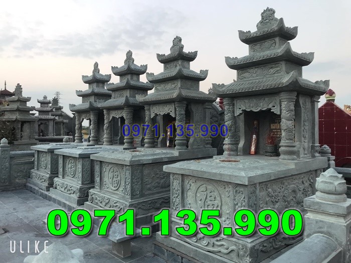 - Mô tả: Mộ đá 3 mái là kiểu thiết kế lớn với ba tầng mái chồng lên nhau, mang đậm nét truyền thống. Mộ này thường được chạm khắc với nhiều hoa văn phong thủy, biểu tượng cho sự bảo vệ và tôn vinh người đã khuất.