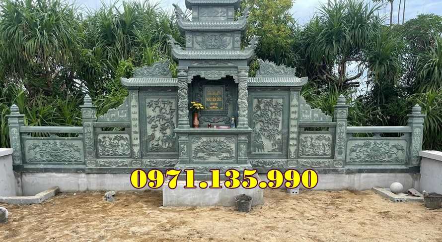 Am thờ – Lăng thờ có kích thước thiết kế là 367 x 107 x 320 bao gồm có cung thờ chính và cánh gió hai bên. Đây là mẫu lăng thờ có kích thước khá lớn phù hợp với các khu lăng mộ nghĩa trang gia đình có diện tích xây dựng rộng. Các số đo đều là số đẹp mang lại may mắn và tài lộc cho con cháu.