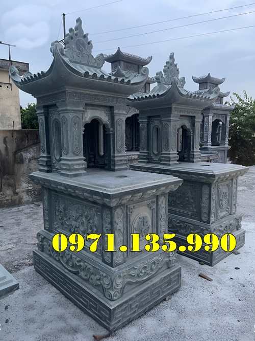 - Mô tả: Mộ 2 mái bằng đá là phiên bản nâng cấp từ mộ 1 mái, với hai tầng mái xếp chồng lên nhau. Thiết kế này mang đến sự bề thế và trang trọng hơn, thể hiện lòng kính trọng sâu sắc đối với người đã khuất. Mộ 2 mái thường có hoa văn tinh xảo, phù hợp với các dòng họ lớn.