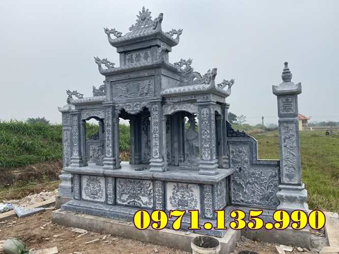 - Mô tả: Mộ 2 mái bằng đá là phiên bản nâng cấp từ mộ 1 mái, với hai tầng mái xếp chồng lên nhau. Thiết kế này mang đến sự bề thế và trang trọng hơn, thể hiện lòng kính trọng sâu sắc đối với người đã khuất. Mộ 2 mái thường có hoa văn tinh xảo, phù hợp với các dòng họ lớn.