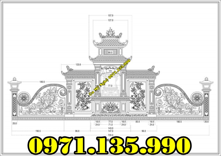Am thờ – Lăng thờ có kích thước thiết kế là 367 x 107 x 320 bao gồm có cung thờ chính và cánh gió hai bên. Đây là mẫu lăng thờ có kích thước khá lớn phù hợp với các khu lăng mộ nghĩa trang gia đình có diện tích xây dựng rộng. Các số đo đều là số đẹp mang lại may mắn và tài lộc cho con cháu.