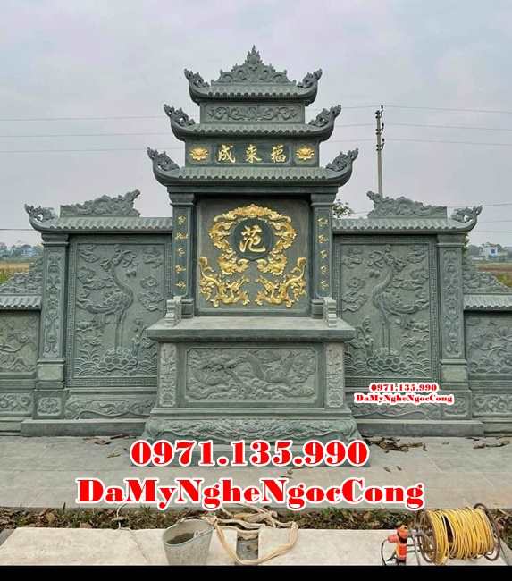 Am thờ – Lăng thờ có kích thước thiết kế là 367 x 107 x 320 bao gồm có cung thờ chính và cánh gió hai bên. Đây là mẫu lăng thờ có kích thước khá lớn phù hợp với các khu lăng mộ nghĩa trang gia đình có diện tích xây dựng rộng. Các số đo đều là số đẹp mang lại may mắn và tài lộc cho con cháu.