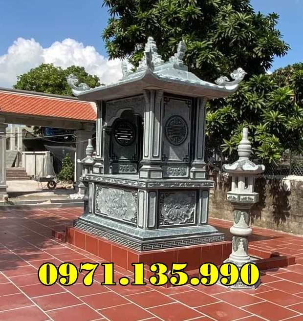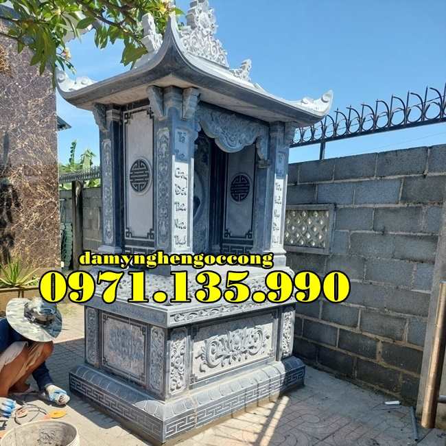 Miếu thờ 2 mái đá xanh, chạm sen – rồng được đặt nhiều trong khuôn viên mộ gia đình.