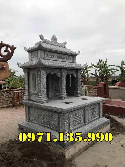 - Mô tả: Mộ 2 mái bằng đá là phiên bản nâng cấp từ mộ 1 mái, với hai tầng mái xếp chồng lên nhau. Thiết kế này mang đến sự bề thế và trang trọng hơn, thể hiện lòng kính trọng sâu sắc đối với người đã khuất. Mộ 2 mái thường có hoa văn tinh xảo, phù hợp với các dòng họ lớn.