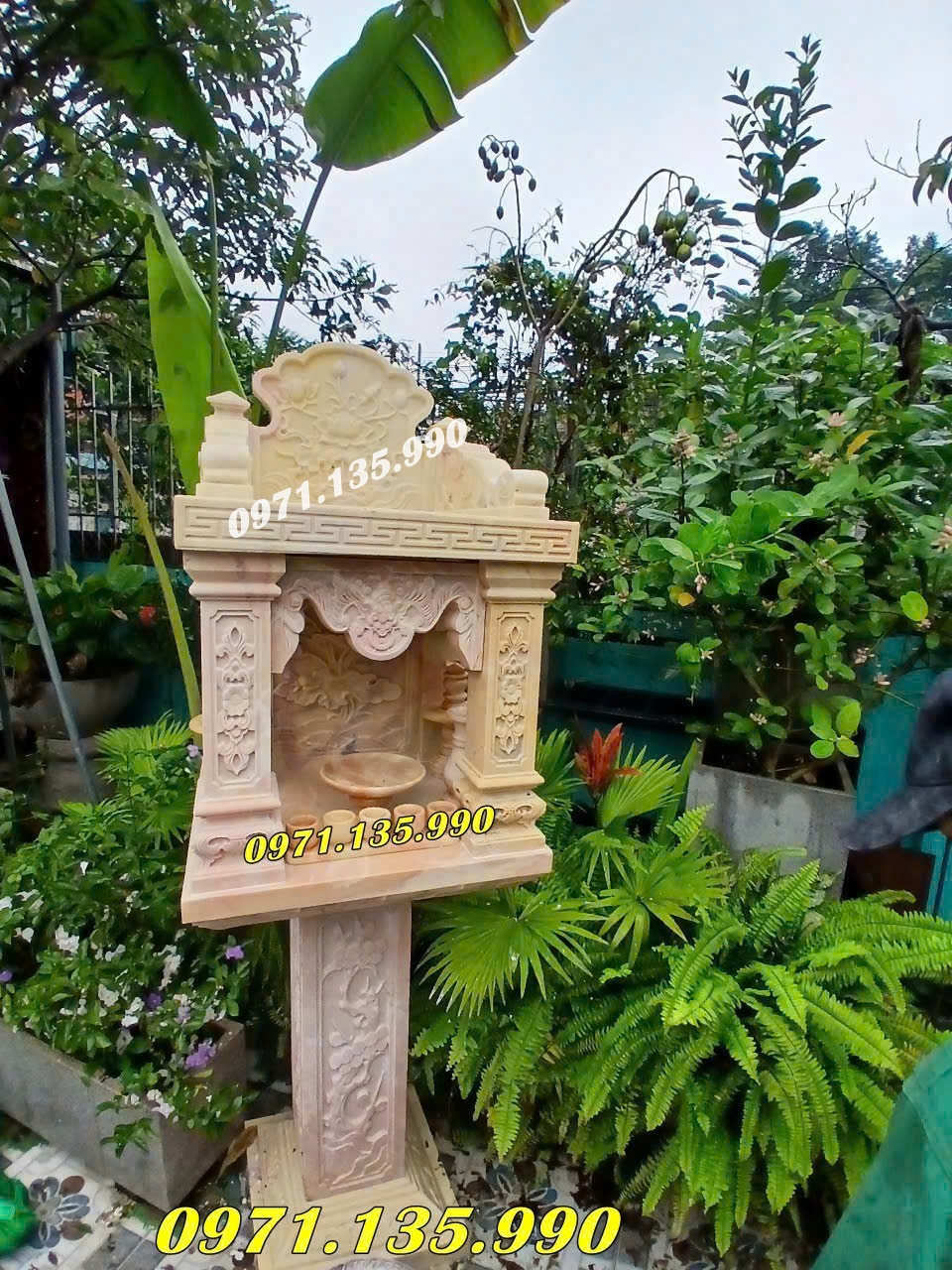 Đá vàng tự nhiên: Mẫu cây hương ngoài trời bằng đá vàng có kích thước 81 x 81 cm, chiều cao 107 cm, giá tham khảo khoảng 22.000.000 VNĐ.