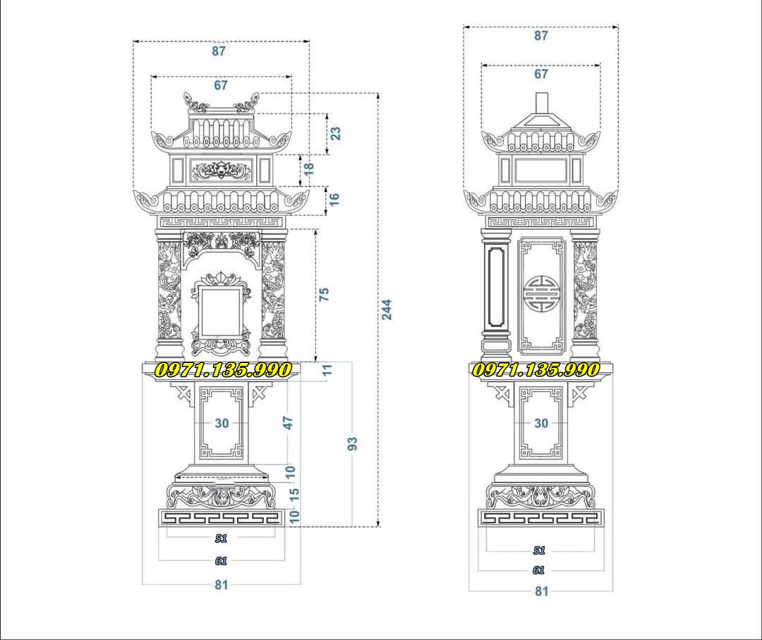 Miếu lớn (khu tâm linh, lăng mộ): Rộng từ 127cm trở lên, sâu từ 127cm trở lên, cao 2–3m hoặc hơn. Mái 3 hoặc 4 tầng, có thể làm theo thiết kế riêng.