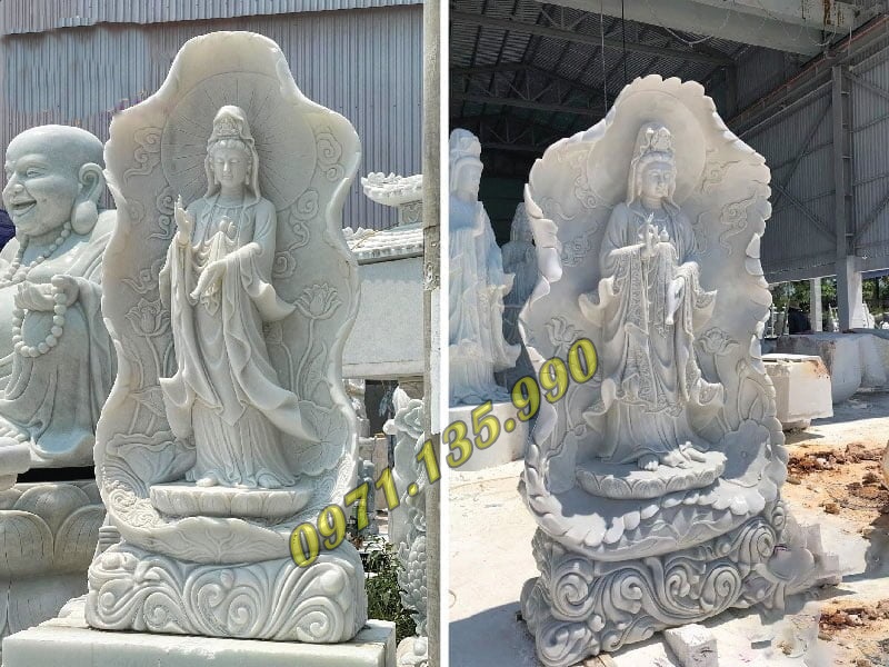Màu sắc: Đá cẩm thạch tự nhiên thường có màu trắng ngà, trắng xanh hoặc xanh ngọc, tượng trưng cho sự thanh khiết, cao quý và thuần tịnh, rất phù hợp với hình ảnh Quan Âm Bồ Tát.