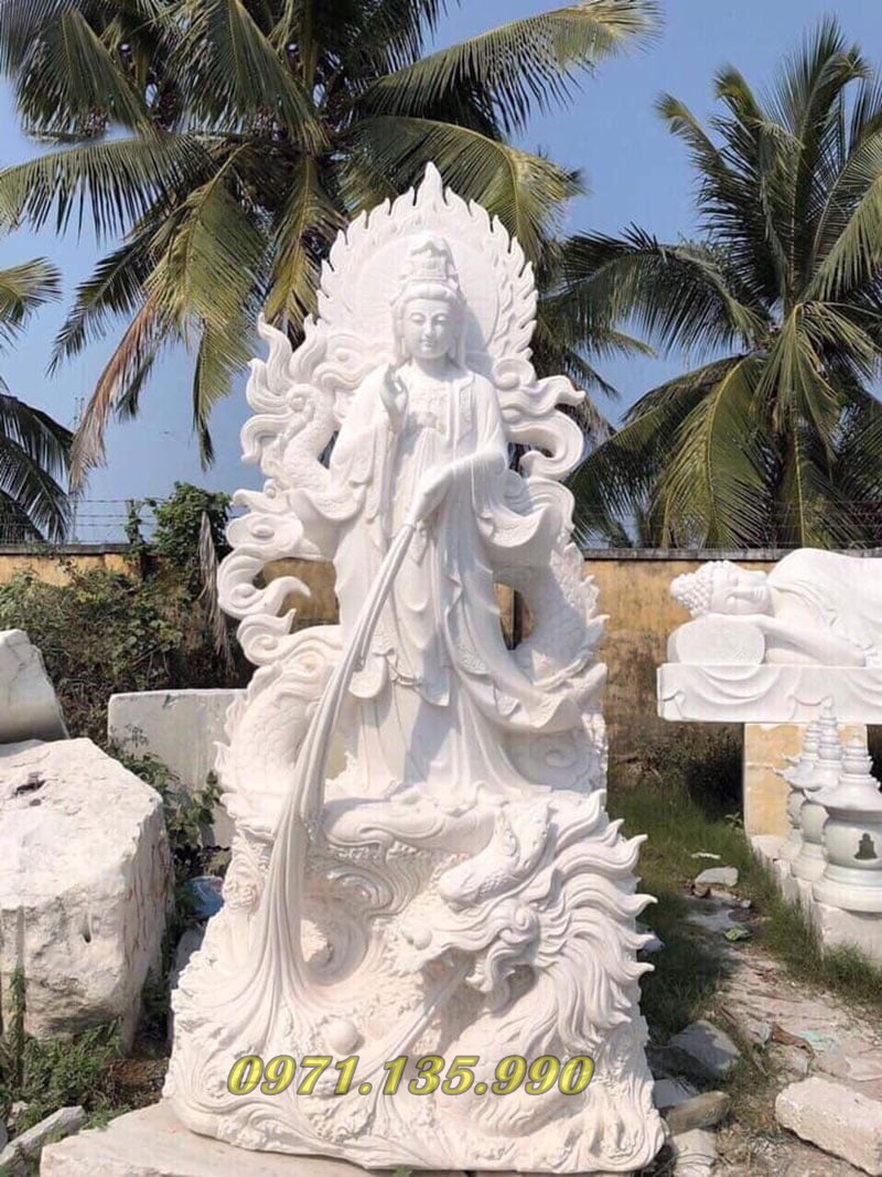 Màu sắc: Đá cẩm thạch tự nhiên thường có màu trắng ngà, trắng xanh hoặc xanh ngọc, tượng trưng cho sự thanh khiết, cao quý và thuần tịnh, rất phù hợp với hình ảnh Quan Âm Bồ Tát.