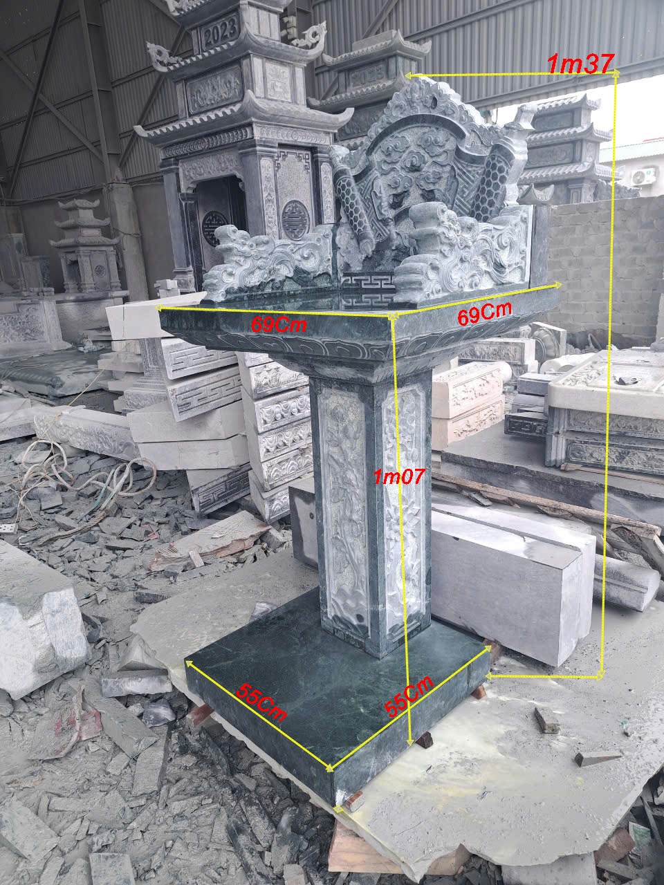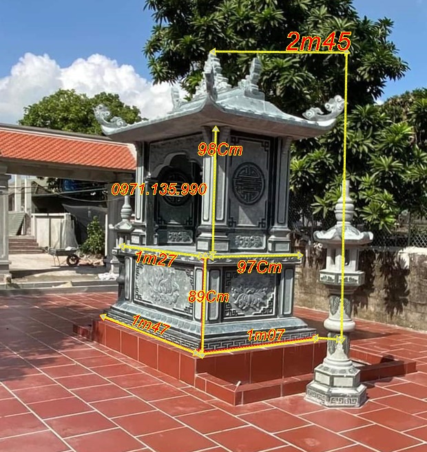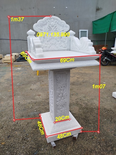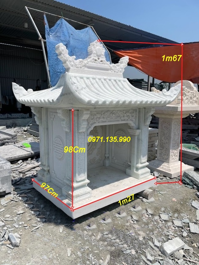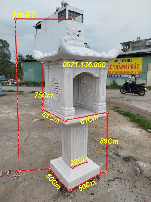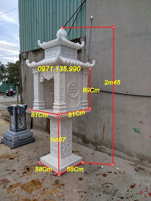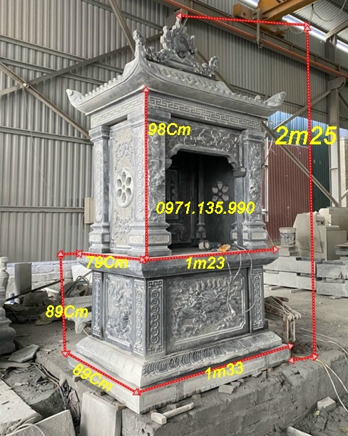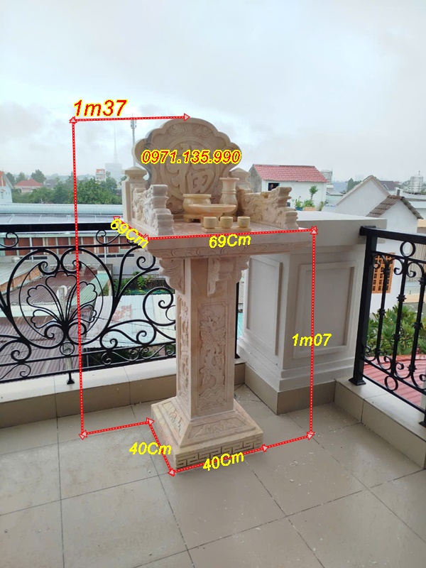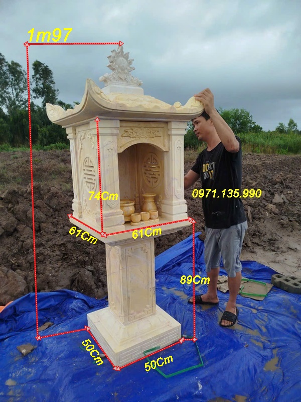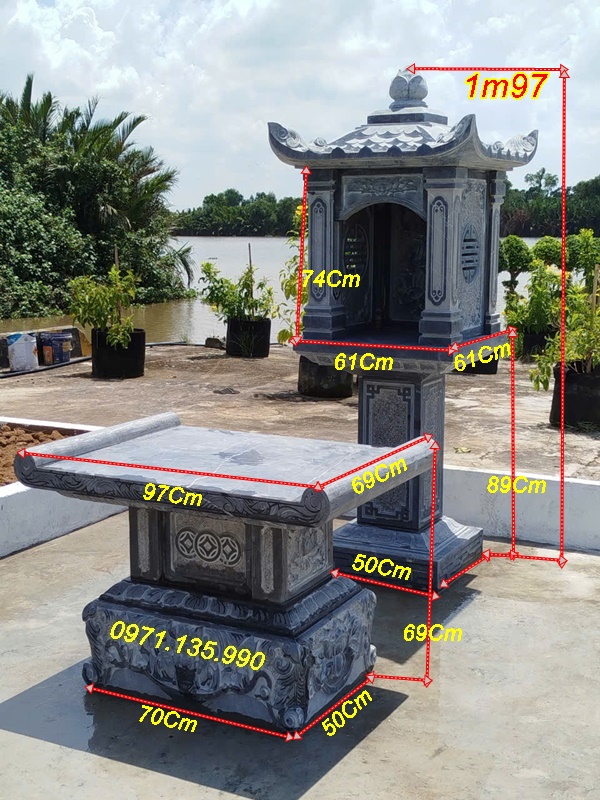 Bàn thờ thiên địa ngoài trời bằng đá có thiết kế hiện đại, chạm khắc hoa văn tinh xảo, với những mẫu cây hương đá có mái che, hay đơn giản không mái. Những mẫu miếu thờ thần linh bằng đá được lấy kích thước dựa trên số đỏ cung hoàng đạo trên thước lỗ ban với các kích thước mặt bàn khác nhau như: vuông 61cm, vuông 69cm, vuông 81cm, vuông 89cm, vuông 1m07, hay hình chữ nhật với kích thước 81*61, 89*69. Mẫu cây hương ngoài trời bằng đá có mái che được làm với kích thước, vuông 69 cm, vuông 81 cm, vuông 89cm, với những cây hương ngoài trời lắp đặt tại công ty, xí nghiệp, sẽ có kích thước mặt bàn vuông lớn hơn như: 1m07, 1m27, 1m33, 1m44, 1m55, 1m67,…