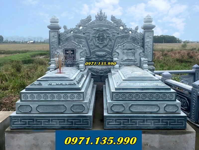 - Mô tả: Mộ đôi bằng đá được thiết kế để an táng hai người (thường là vợ chồng). Kiến trúc của mộ đôi thể hiện sự gắn kết giữa hai người ngay cả khi qua đời. Phần nấm mộ được làm đối xứng, hoa văn được chạm khắc tỉ mỉ, thường là các biểu tượng về sự trường thọ, bình an.