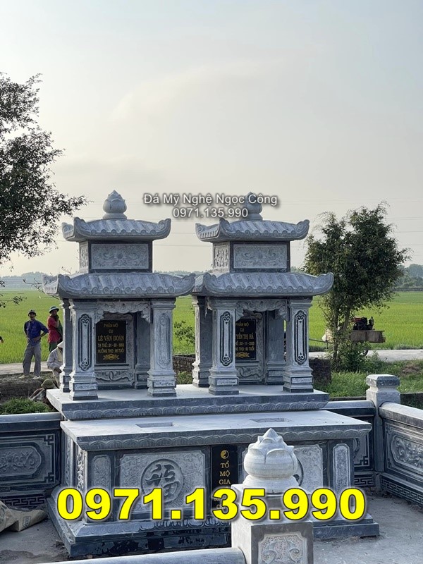- Mô tả: Mộ đôi bằng đá được thiết kế để an táng hai người (thường là vợ chồng). Kiến trúc của mộ đôi thể hiện sự gắn kết giữa hai người ngay cả khi qua đời. Phần nấm mộ được làm đối xứng, hoa văn được chạm khắc tỉ mỉ, thường là các biểu tượng về sự trường thọ, bình an.
