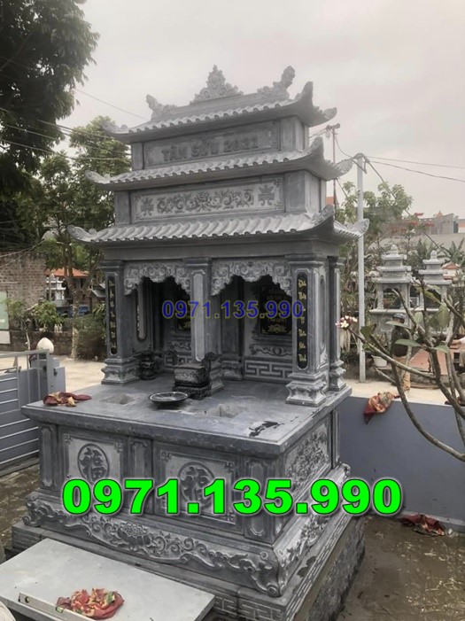 - Mô tả: Mộ 2 mái bằng đá là phiên bản nâng cấp từ mộ 1 mái, với hai tầng mái xếp chồng lên nhau. Thiết kế này mang đến sự bề thế và trang trọng hơn, thể hiện lòng kính trọng sâu sắc đối với người đã khuất. Mộ 2 mái thường có hoa văn tinh xảo, phù hợp với các dòng họ lớn.