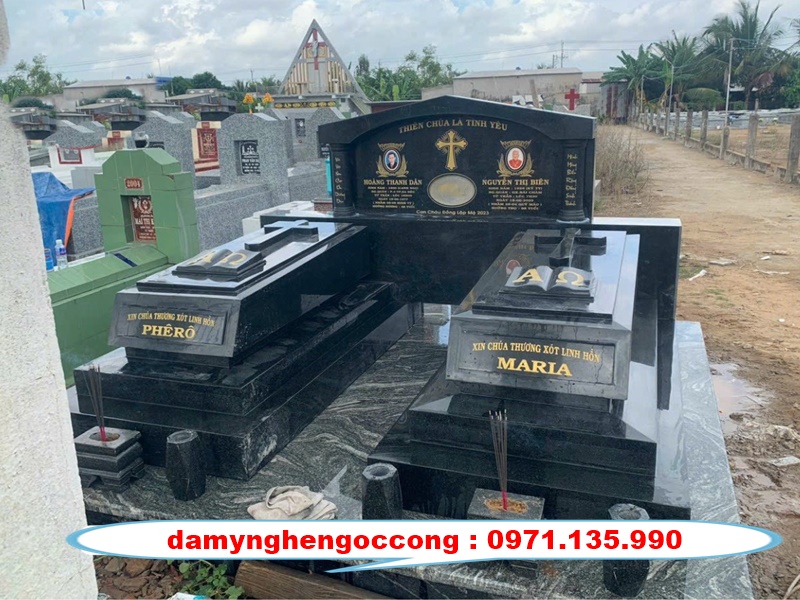 - Mô tả: Mộ Công Giáo bằng đá được thiết kế đặc biệt với hình ảnh cây thánh giá và các hoa văn tôn giáo như thiên thần, cây nho. Mẫu mộ này mang tính tôn giáo sâu sắc, thể hiện lòng tôn kính và đức tin của gia đình.