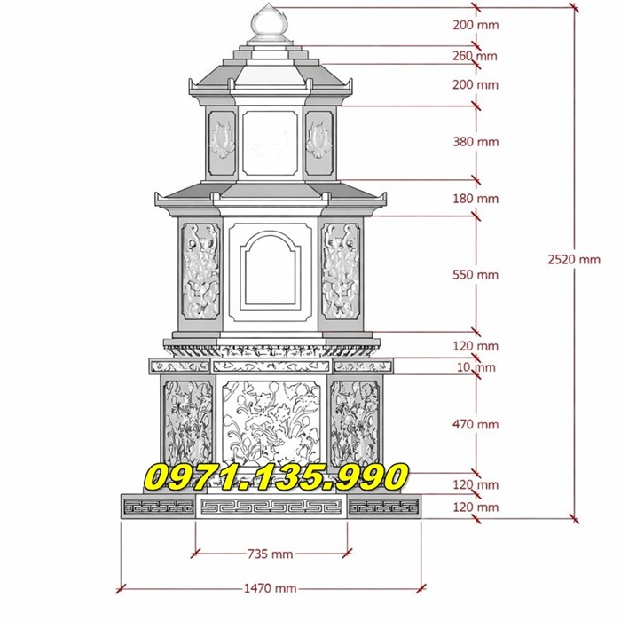 Kích thước theo chiều cao mộ tháp đá : Có thể thay đổi theo yêu cầu của khách hàng, thông thường từ 1m47 đến 3m67 hoặc hơn, tùy vào quy mô và thiết kế cụ thể.