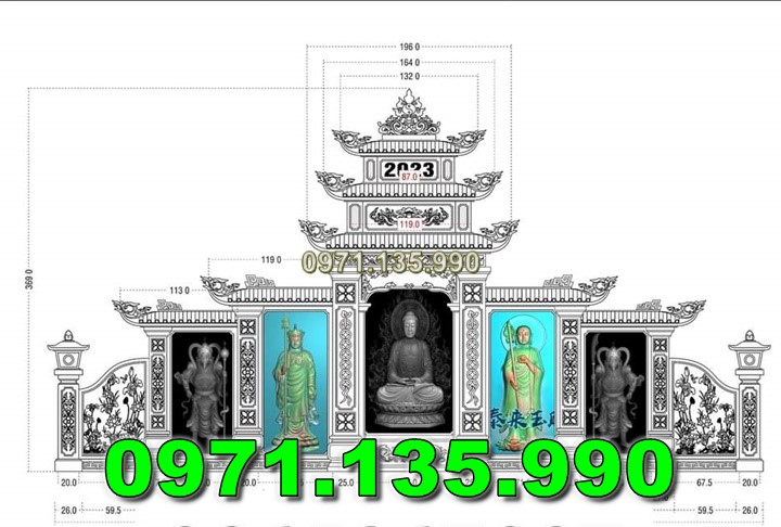 Am thờ – Lăng thờ có kích thước thiết kế là 367 x 107 x 320 bao gồm có cung thờ chính và cánh gió hai bên. Đây là mẫu lăng thờ có kích thước khá lớn phù hợp với các khu lăng mộ nghĩa trang gia đình có diện tích xây dựng rộng. Các số đo đều là số đẹp mang lại may mắn và tài lộc cho con cháu.